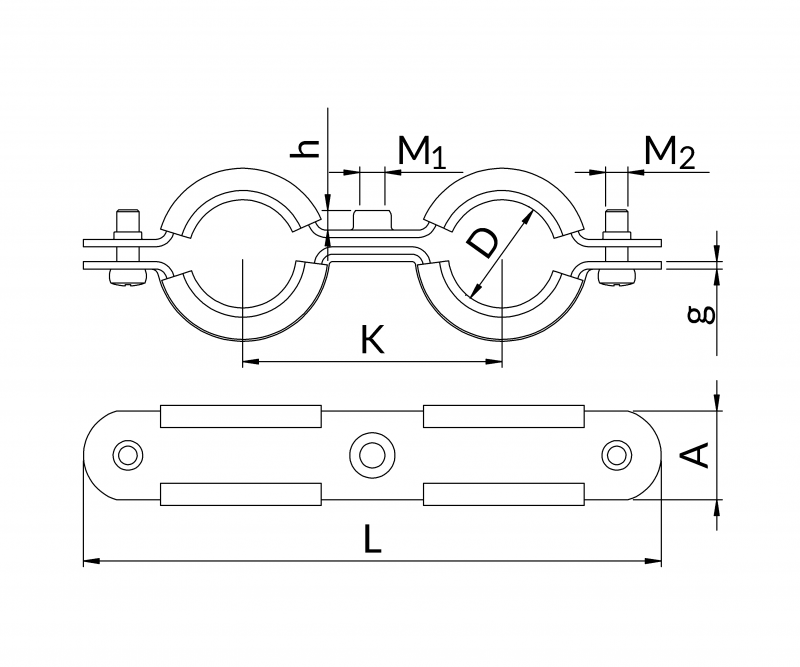 | Gama de diametre D [mm] | Marimea M 1 | Înălțimea conexiunii h [mm] | Versiune | Dimensiunile clemei L [mm]A xg [mm] | Șuruburi de conectare M 2 | Sarcina admisibila [kN] | Greutate [kg] | Cantitate [buc/pachet] | Marca pentru comandă | Număr de catalog |
